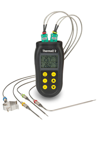 De ThermaQ 2 is een digitale thermometer met 4 ingangen voor thermokoppel temperatuurvoelers. De aanwijzing kan worden ingesteld op weergave van de temperatuur van voeler T1 & T2 of T3 & T4. Zo heeft u gelijktijdig een aanwijzing van meerdere temperaturen. Bijvoorbeeld van de oventemperatuur en meerdere gerechten in de oven of van complexe processen! Tevens worden de max/min waarden weergegeven en kunnen per voeler alarmen ingesteld worden.