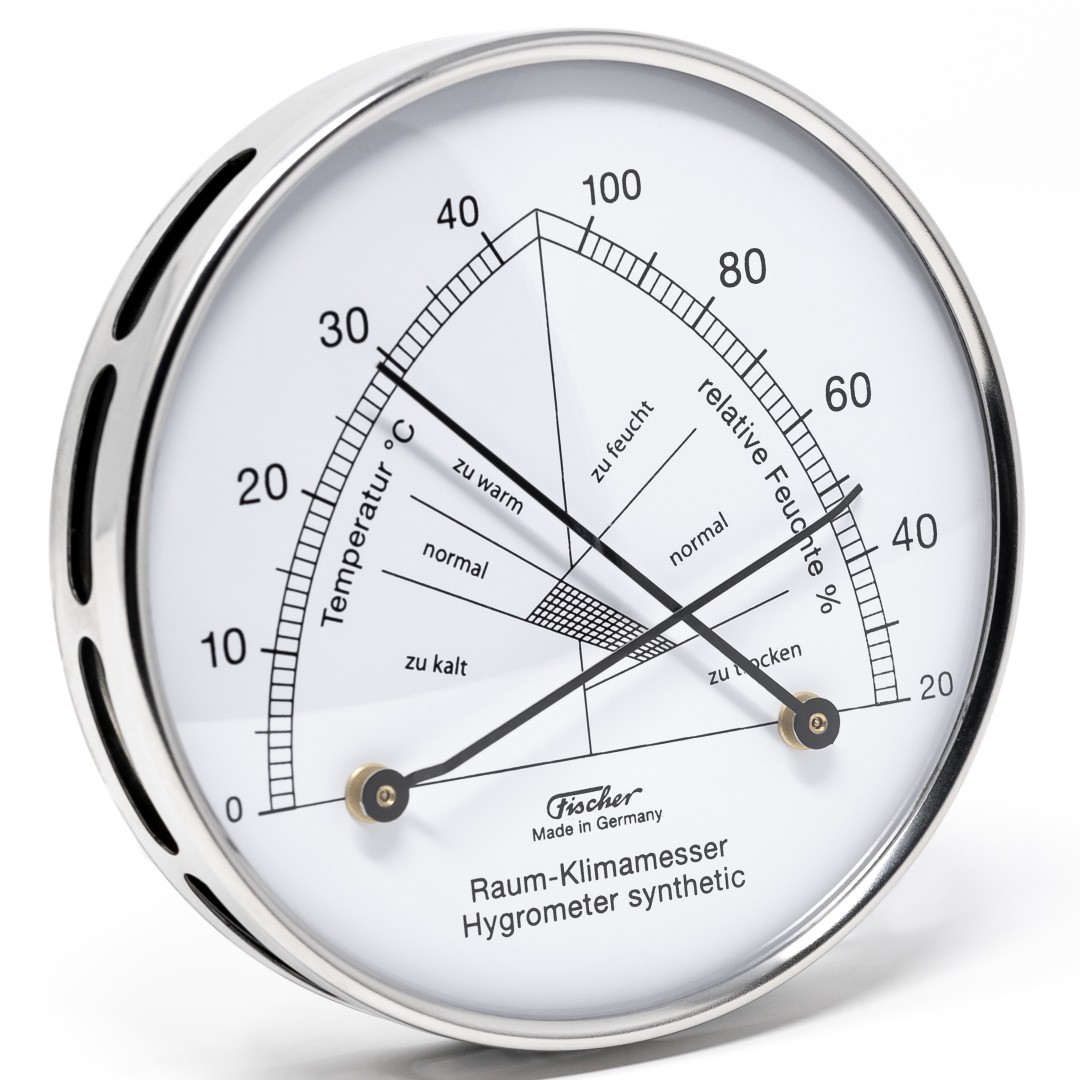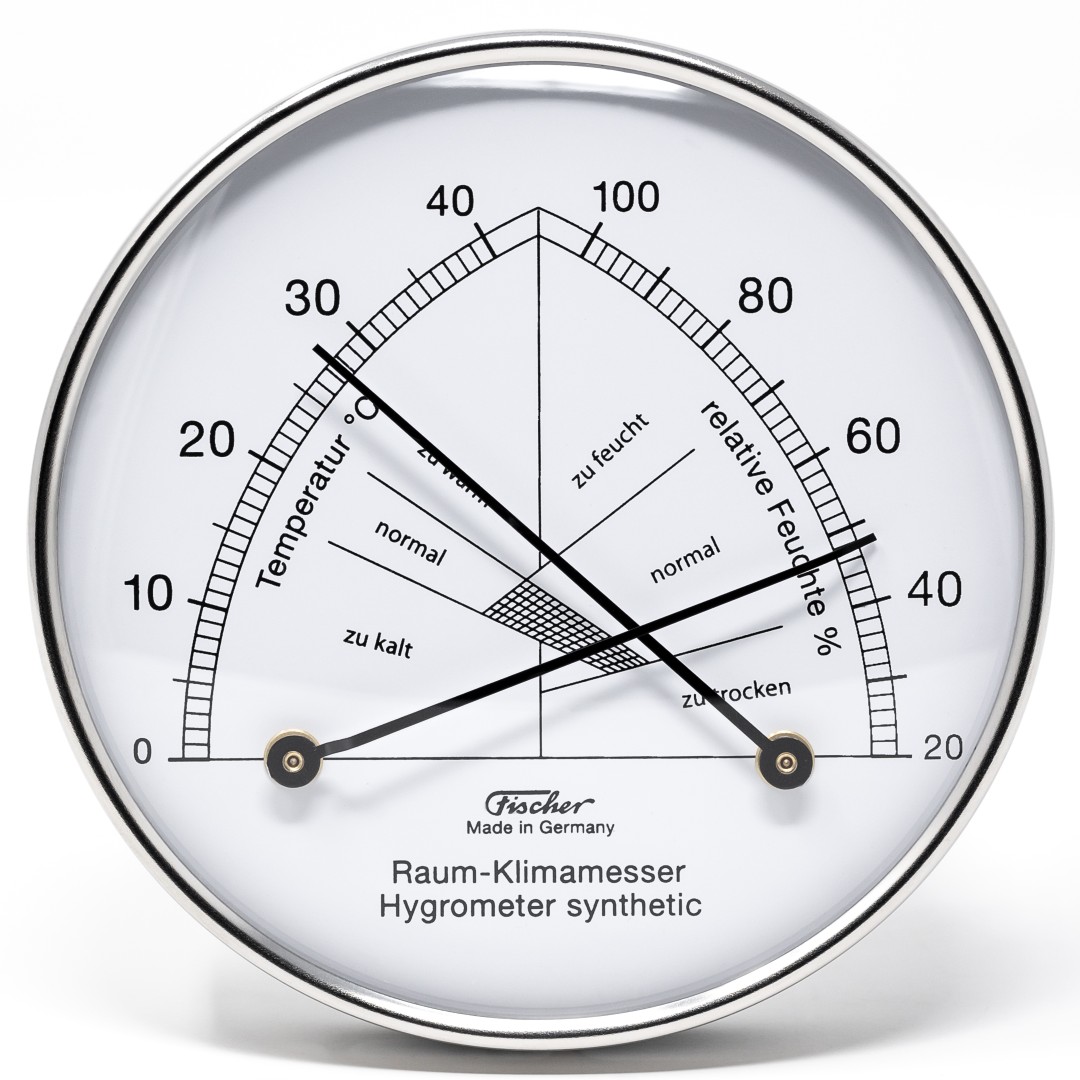 Synthetische hygrometer gecombineerd met bimetaalthermometer om binnenklimaat te meten. Het binnenklimaat is gezond wanneer beide wijzers binnen de gemarkeerde lijnen vallen.